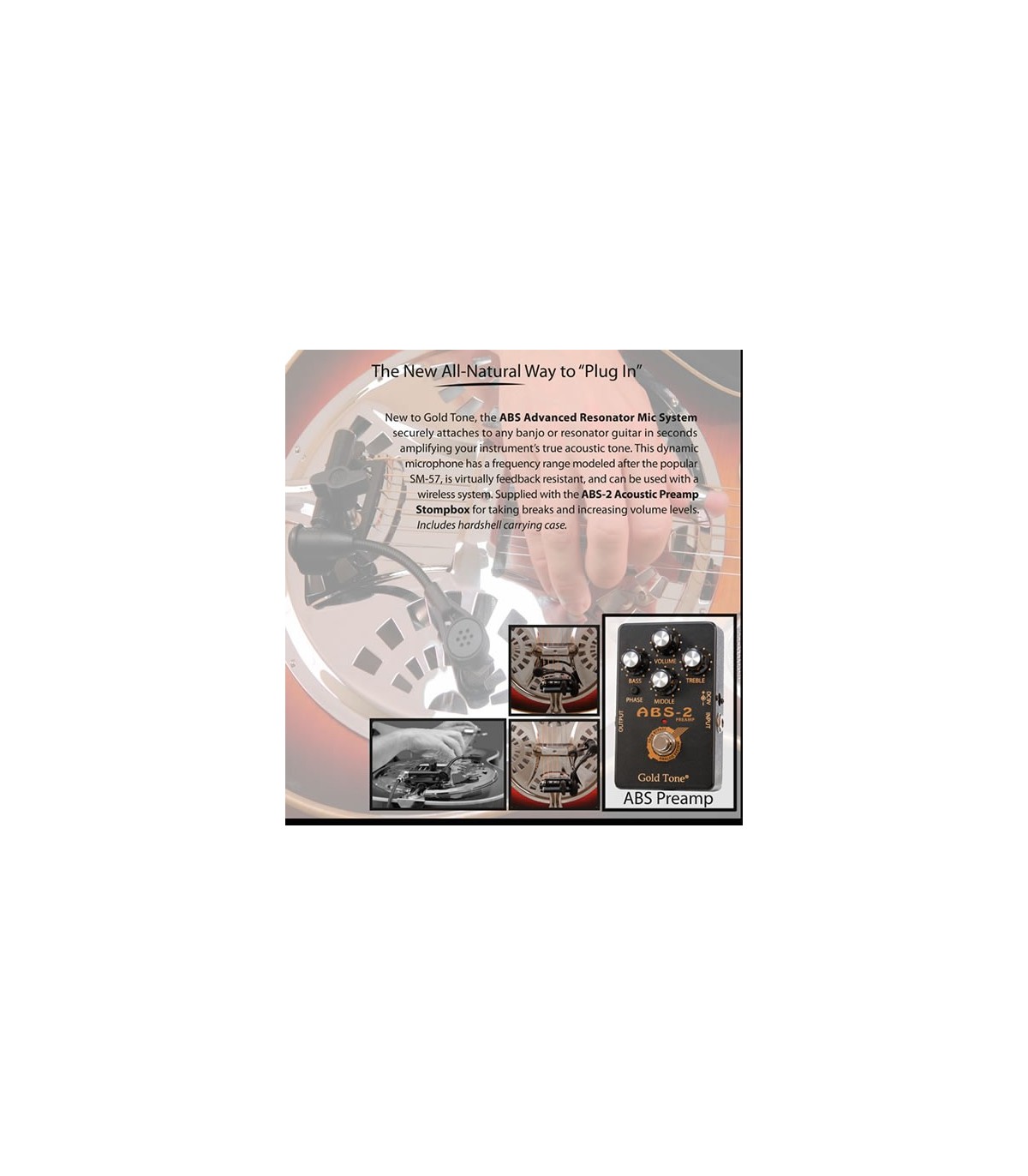 The ABS system is essential equipment for the performing banjoist or resonator player. By attaching a dynamic cardoid microphone to the end of a small gooseneck cable, the ABS reliably captures the music you generate at the precise sweet spot where you sound the best. Attachment and adjustment for ideal placement is simple and easy. ABS is shock mounted to prevent the introduction of extraneous vibrations. With no exposed wiring, ABS can be transferred from one banjo to another in seconds.
