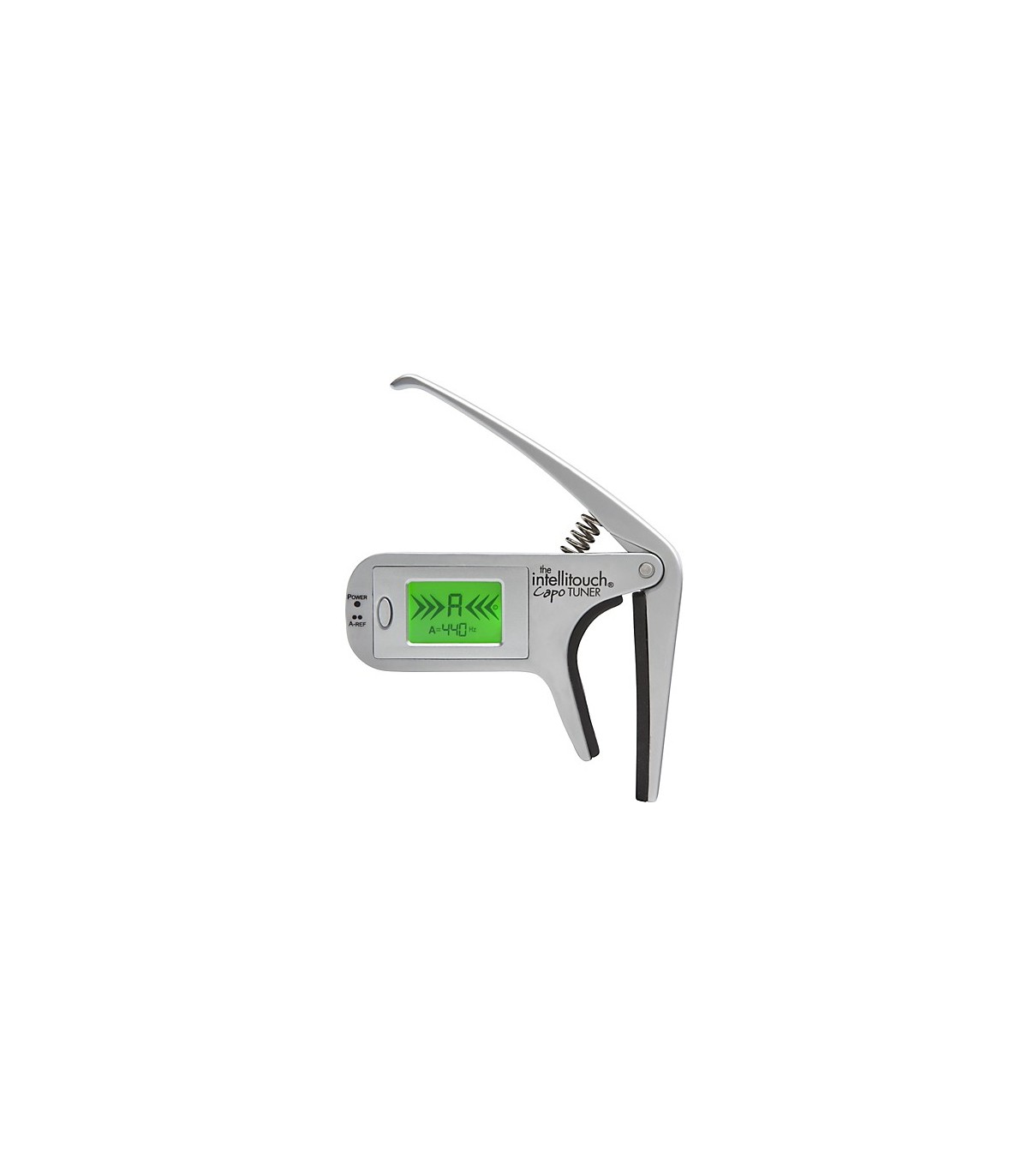 The Intellitouch CT1 Capo Tuner combines vibration-based tuning with a single-action capo. It is automatic, chromatic, and displays the measured pitch on a large, backlit display for easy tuning. Designed to tune 6 and 12 string, electric and acoustic guitars without interference from background noise, the CT1 feels the instrument's vibration instead of sound.