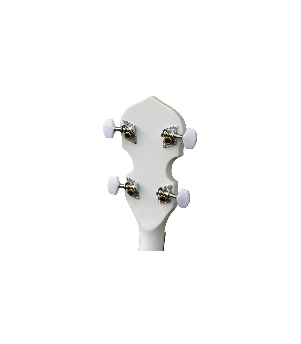 It is red white and blue on the head with a white wood resonator,white smooth neck and rosewood fingerboard. The head stock looks the best with its American flag colors. Other features include a geared 5th peg, 18 brackets for beter head tension and star inlays on the neck!