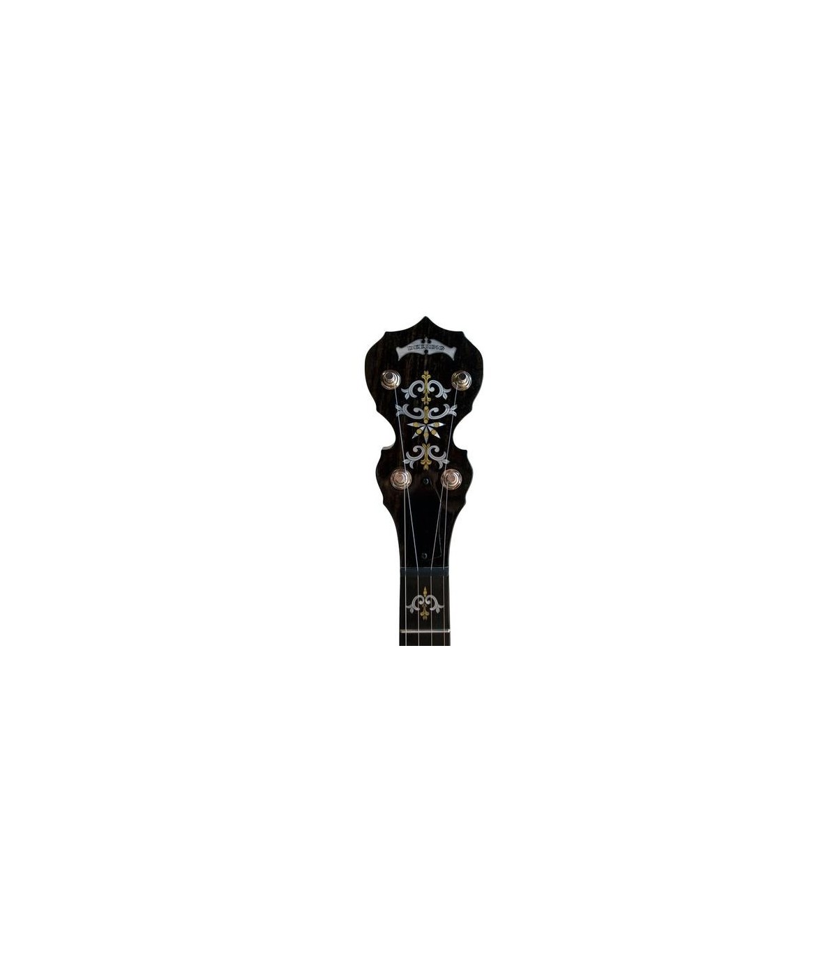 The mother of pearl inlay in the peghead, is the very first Deering logo designed by Greg Deering for his first banjo in 1969. The multicolor binding and high gloss finish enhance the gold and perloid inlays on the exotic, natural ebony fingerboard. "The inspiration for the inlay artwork comes from the early Boston banjo masters. And if you look at the peghead of the Deluxe, it has some of the same elements as the Sierra, but it is much more expanded and it comes alive with the turn of the century Boston masters element - and that was just the design that flowed out onto the page. It's a lot of fun to have that kind of artwork on a banjo that people can afford. The first professional banjo we made was the Deluxe so it always has a very dear spot to us because it was the first professional banjo we made way back in '79." Greg Deering