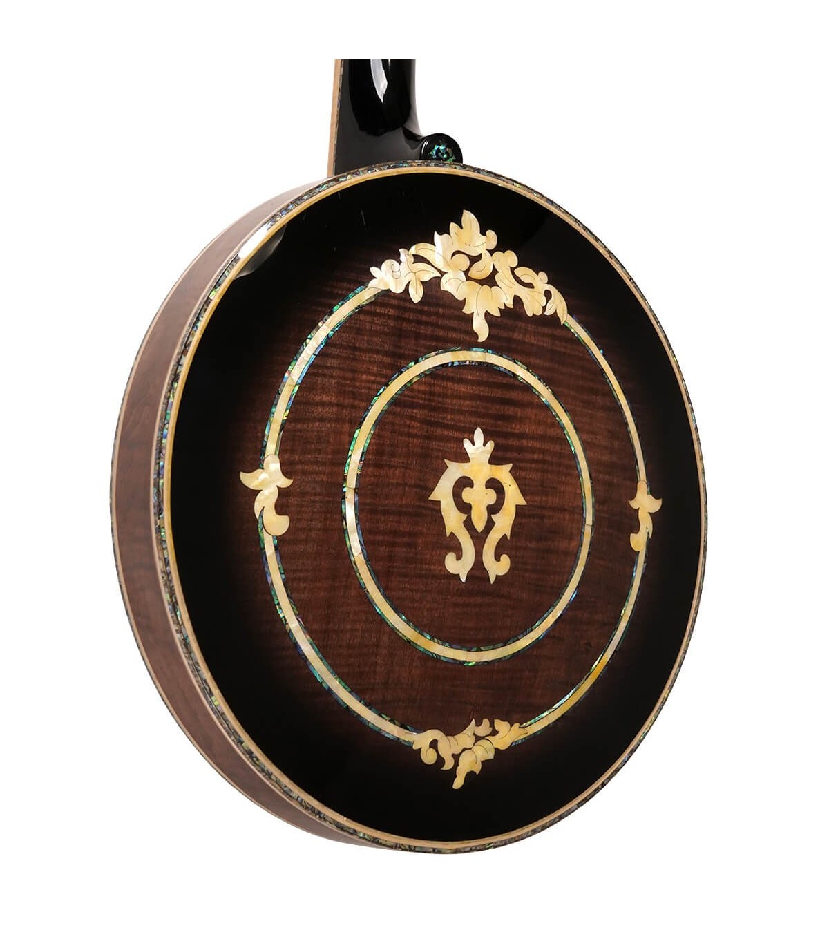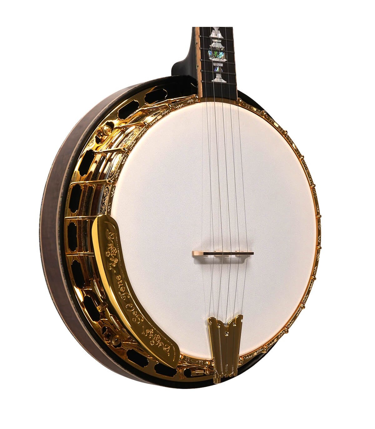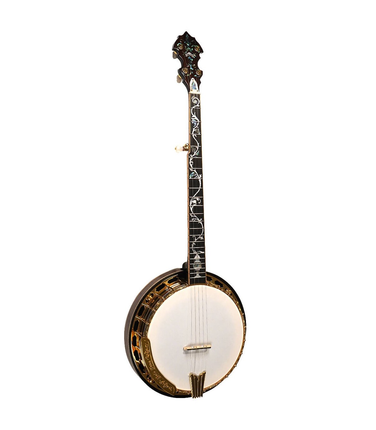This gold-plated beauty has all the spec wanted on a high-end profession banjo. It has a curly maple neck and matching curly maple/abalone binding combine for a highly decorative 5-string. The sand-cast bell bronze tone ring is used in only the best banjos and provides a loud penetrating tone. A unique abalone/pearl truss rod cover matches the exquisite inlay throughout the banjo.