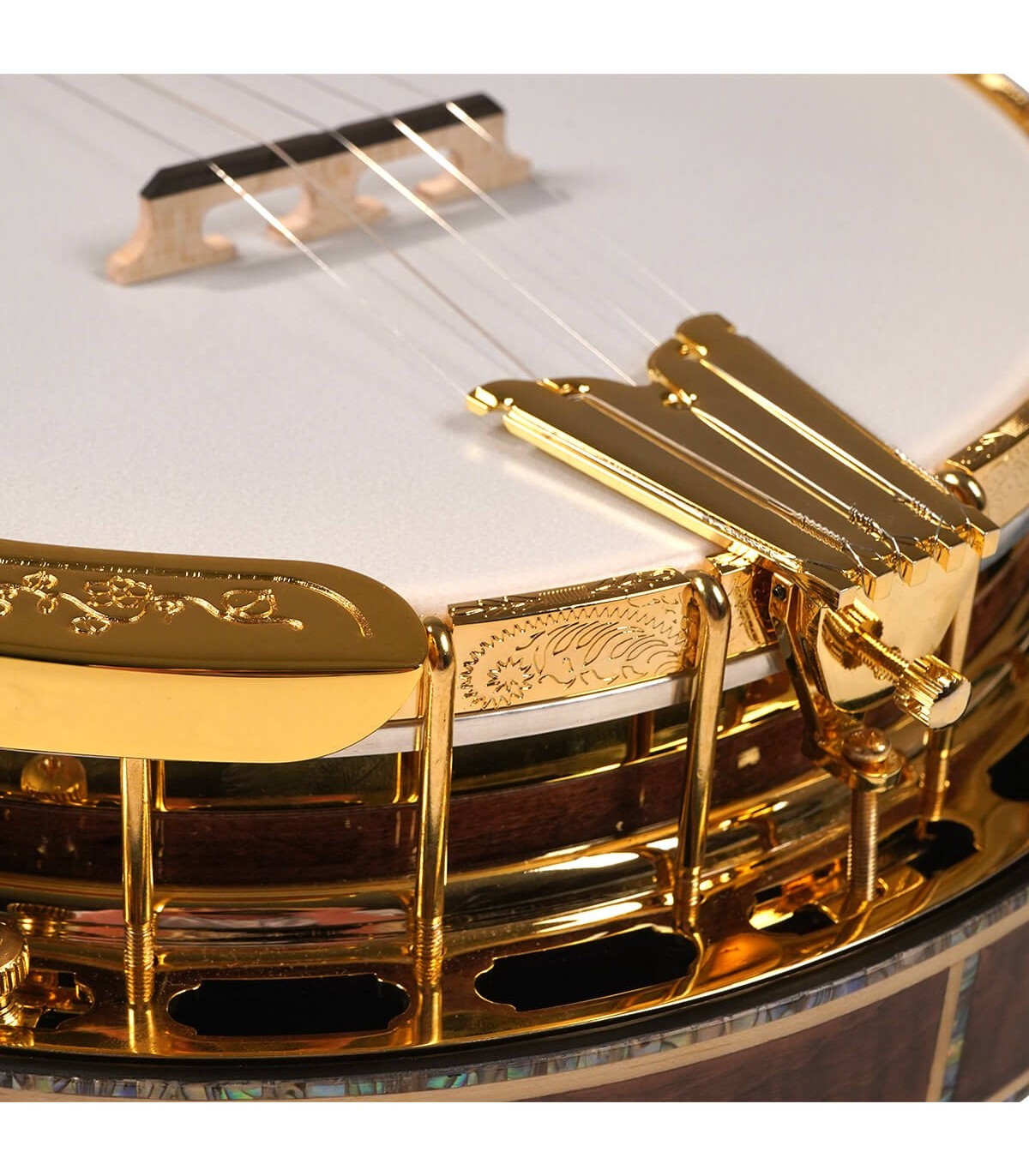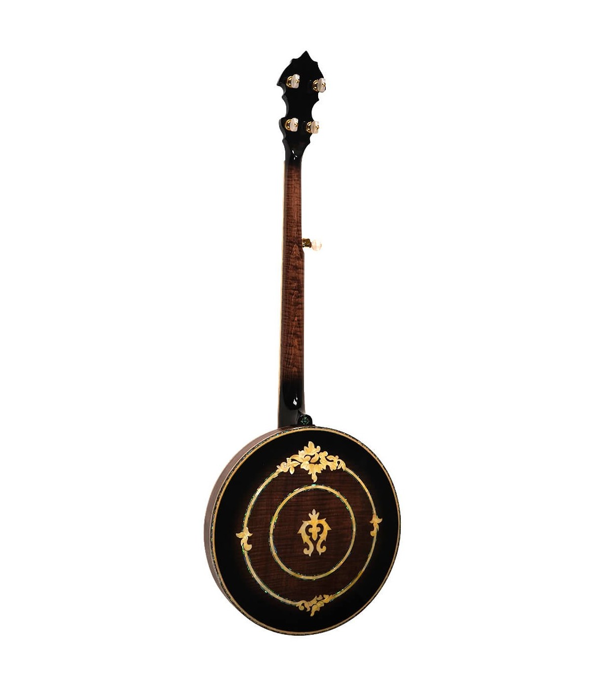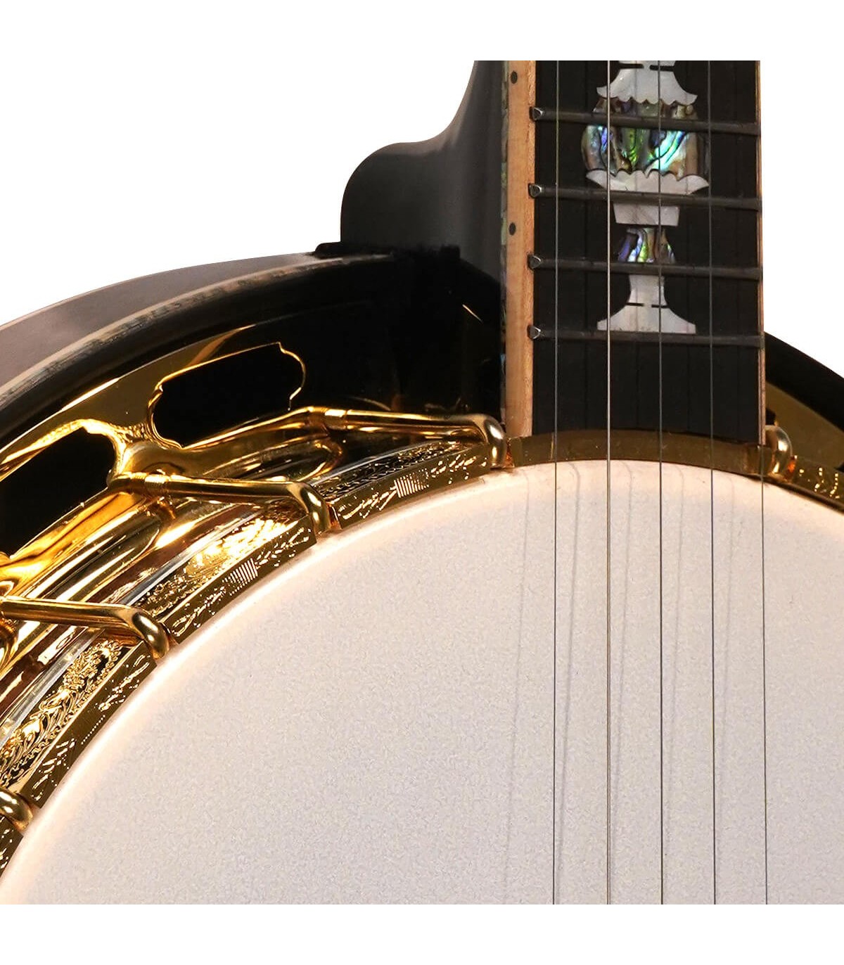 This gold-plated beauty has all the spec wanted on a high-end profession banjo. It has a curly maple neck and matching curly maple/abalone binding combine for a highly decorative 5-string. The sand-cast bell bronze tone ring is used in only the best banjos and provides a loud penetrating tone. A unique abalone/pearl truss rod cover matches the exquisite inlay throughout the banjo.