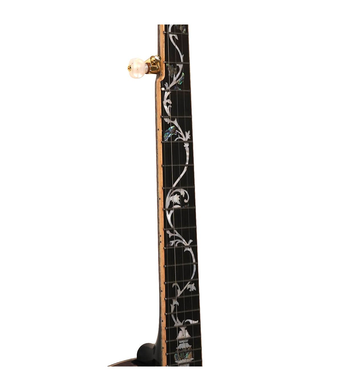 The OB-300 uses the modified tree of life inlay on the fingerboard so the banjo player can easily deter- mine the fret positions. Notice the fingerboard has flowers on the landmark fret positions and only vines on other positions. Simple but effective, and only the player knows the difference!