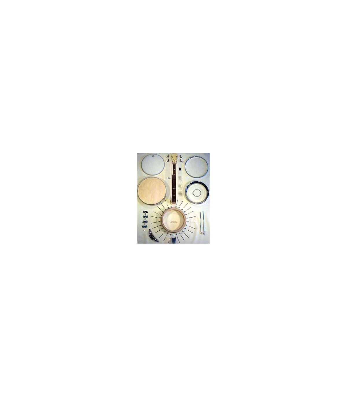 The 11" maple rim is pre-made and guide holes are drilled. All metal parts are chrome-plated and ready for assembly. Features include maple neck, maple body, pre-slotted rosewood fingerboard, frets are all pre-cut, snow flake position markers (already inlayed) , double coordinator rods, sealed geared tuning machines, Price Licensed tailpiece, two-way truss rod, bone nut, Remo head, and full walled resonator with binding.