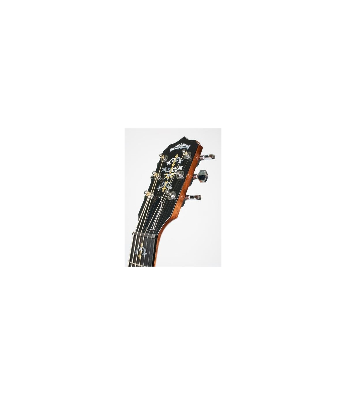 The mother of pearl inlay in the peghead, is the very first Deering logo designed by Greg Deering for his first banjo in 1969. The multicolor binding and high gloss finish enhance the gold and perloid inlays on the exotic, natural ebony fingerboard. "The inspiration for the inlay artwork comes from the early Boston banjo masters. And if you look at the peghead of the Deluxe, it has some of the same elements as the Sierra, but it is much more expanded and it comes alive with the turn of the century Boston masters element - and that was just the design that flowed out onto the page. It's a lot of fun to have that kind of artwork on a banjo that people can afford. The first professional banjo we made was the Deluxe so it always has a very dear spot to us because it was the first professional banjo we made way back in '79." Greg Deering