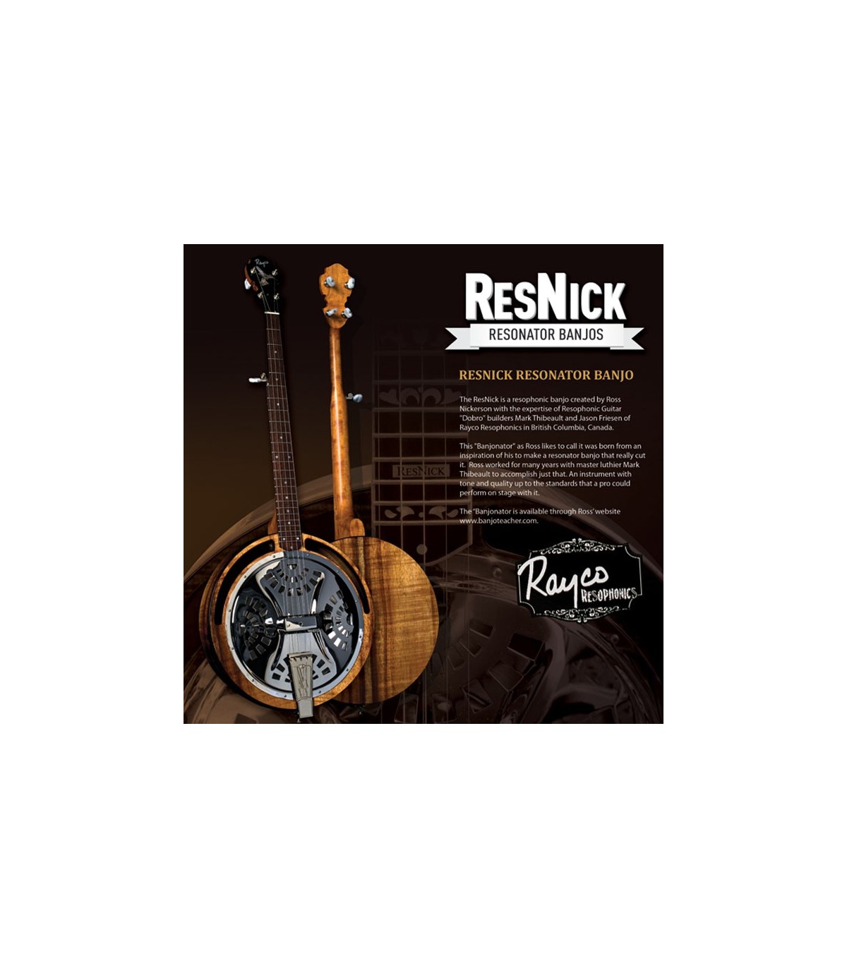 The ResNick is a resophonic banjo designed by Ross Nickerson with the expertise of Resophonic Guitar "Dobro" builders Mark Thibeault and Jason Friesen of Rayco Resophonics.